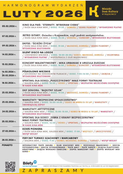 Ferie nie muszą oznaczać nudy, telefonu w ręku czy pytań „co dziś robimy?”. Przygotowaliśmy dla Waszych dzieci ferie pełne filmów, spektakli, warsztatów. Blisko domu, w bezpiecznej przestrzeni. Sprawdź naszą ofertę i zapisz się już dziś! – seanse filmowe dla najmłodszych – spektakle, które uczą i bawią – turniej dla młodych strategów Zapisy dostępne na stronie www.mdkwagrowiec.pl w zakładce WARSZTATY, pod numerem telefonu 67 26 20 545 lub w siedzibie MDK, gdzie chętnie z Wami porozmawiamy!