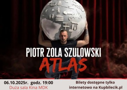 Czujesz czasem, że dźwigasz na barkach cały świat?Rodzina, praca, choroby, kredyty, oczekiwania – codzienność potrafi docisnąć bardziej niż ciężar na siłowni. Piotr Zola Szulowski w swoim najnowszym programie „ATLAS” bierze na siebie wszystkie troski i przekuwa je w godzinną porcję szczerego, przewrotnego i bezkompromisowego humoru. To będzie stand-up o nas – ludziach, którzy próbują udźwignąć świat i nie zwariować. Piotr nie daje gotowych rozwiązań, ale zabiera Cię w rejs po oceanie dystansu, żebyś mogła/mógł poczuć wiatr w żaglach swojej codzienności. — * Występ przeznaczony jest dla osób powyżej 18-go roku życia. * Podczas występu obowiązuje zakaz nagrywania audio oraz video.