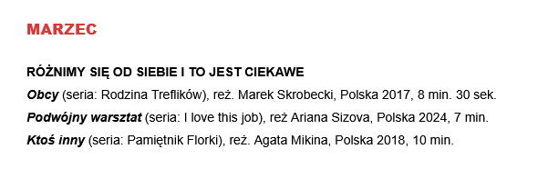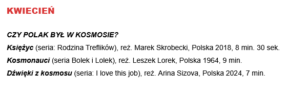 - projekcje 3 filmów krótkometrażowych poprzedzone zabawami edukacyjnymi