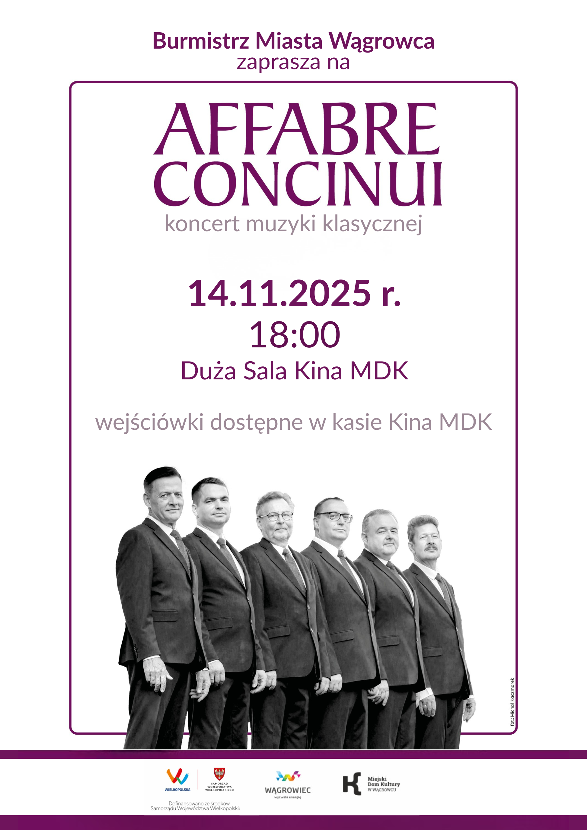 Burmistrz Miasta Wągrowca zaprasza na koncert muzyki klasycznej Affabre Concinui, który odbędzie się 14 listopada 2025 o godz. 18:00 w Dużej Sali Kina MDK (ul. Kościuszki 55).