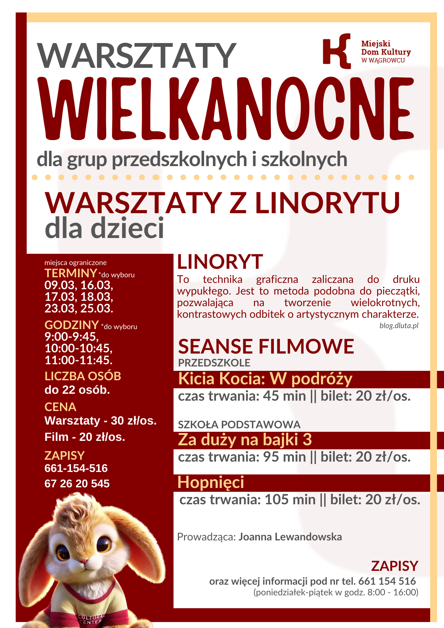 Miejski Dom Kultury w Wągrowcu zaprasza na Warsztaty Wielkanocne! Oferta skierowana jest do grup przedszkolnych oraz szkolnych.